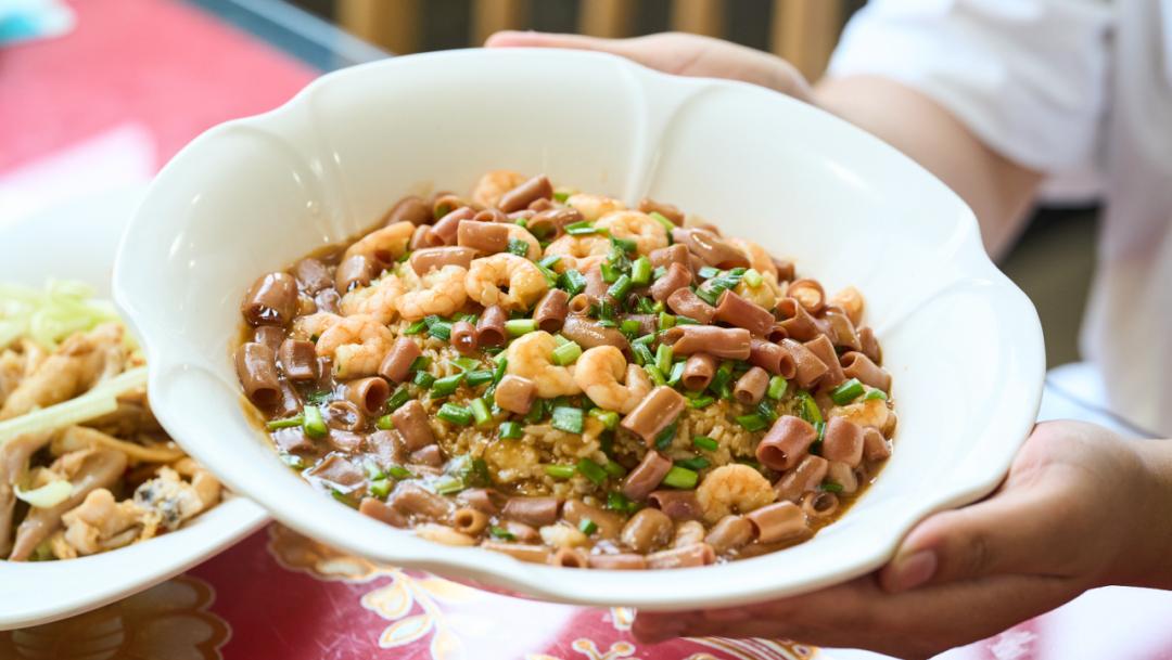 "就是这家老山东开的海鲜馆子,用‘盆’装捞饭给客人..."这家号称是上海必吃的平价小海鲜馆子,晚上等位是他家的常态,还有人开车十几公里专门过来吃。几乎每桌必点的「海肠捞饭」甚至不是最大招牌,到底什么魔力?作为"浇头"的海肠和虾都是每天从威海运来,当日估清,不留存货。量大料足,2个人才能吃得完,满满性价比,端上来放眼望去只有海肠和虾仁,米饭是一点看不见。海肠脆口,比鸭肠还嫩,自带粘液让口感更湿滑,吃起来是咸鲜酱味,回口不可避免地略带腥气。