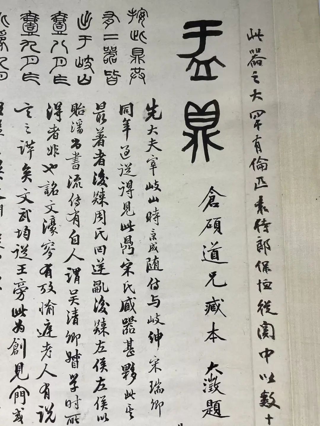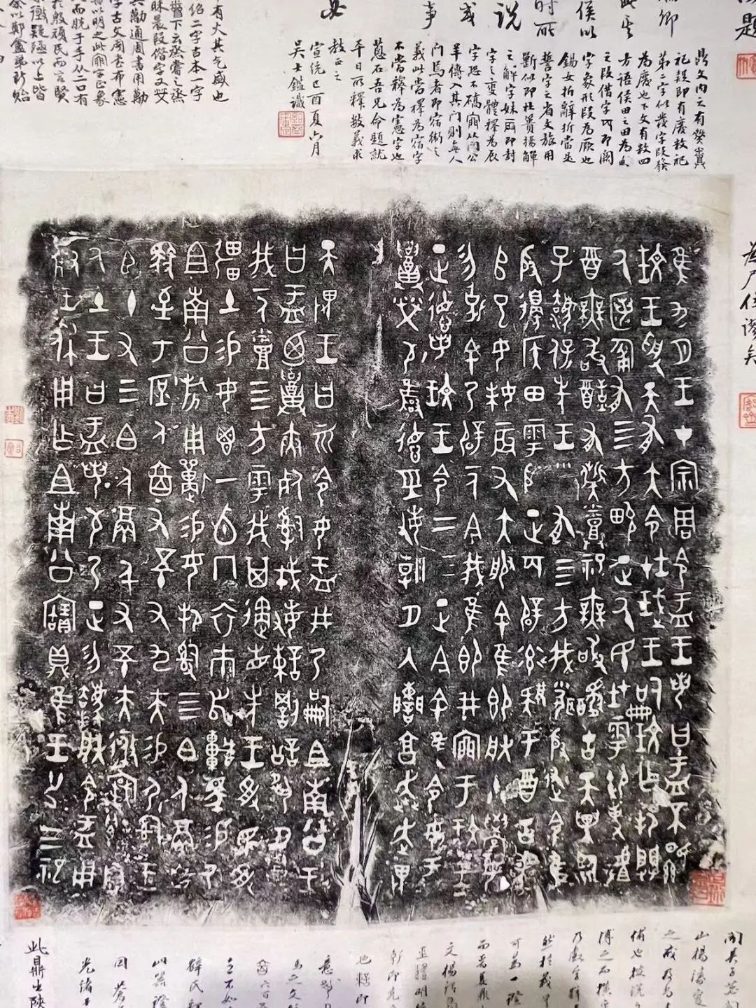 苏州听枫园金石书画雅集现场童衍方展示了其精心收藏的珍罕周盂鼎拓本(吴昌硕藏本),上有吴大澂题:“仓硕道兄藏本”,全幅19行291字,且有沈秉成、杨守敬等名家题跋。盂鼎于清道光年间出土于陕西郿县礼村(今宝鸡眉县),为西周早期青铜礼器中之重器,因作器者是康王时大臣名盂者而得名,辗转被岐山宋金鉴、周庚盛和左宗棠的幕僚袁保恒所得,后入藏潘祖荫府邸。