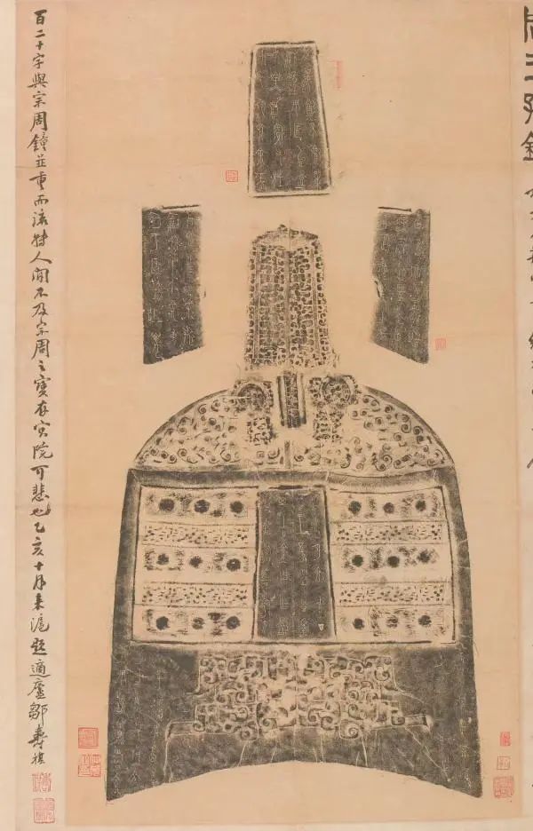《始平公造像题记》卷轴装(局部),是传世最早整幅拓本,徐乃昌旧藏本,其上有童衍方等十多位当代知名金石书画界人士题跋《王孙遗者钟》卷轴装是传世最早最佳拓本,历经盛昱、邹安、何楚侯递藏。钟于光绪初年湖北荆州宜都山出土,历经曹彝卿、潘祖荫、端方等人递藏,后流入海外,归原国际奥委会主席布伦戴奇(1887-1972),现藏美国旧金山亚洲美术博物馆。春秋晚期楚器,王孙遗者,楚庄王之子,名子南,又称公子追舒。此钟铭文书法是楚国金文的经典代表,广受金文爱好者推崇。
