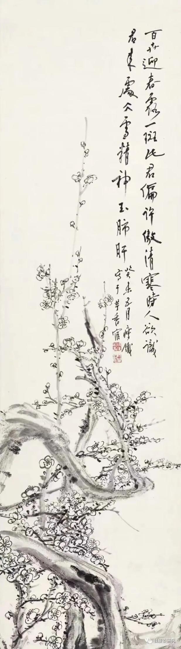 钱瘦铁墨梅《此君偏许傲清寒》听枫园金石书画雅集后,童衍方向苏州国画院赠送精心创作的书法对联《燃苇烹茶,宝鼎浪中浮蟹眼;移松酌酒,金杯影里动龙鳞》。