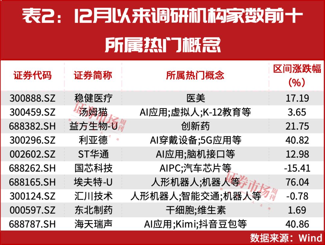 机构12月以来聚焦AI和医药与稳健医疗相似,益方生物和东北制药也都是医药领域的公司(见表2)。其中,前者是一家立足中国具有全球视野的创新型药物研发企业,聚焦于肿瘤、代谢疾病等重大疾病领域,后者是中国重要的药品生产与出口基地,包括单体制剂生产、麻精药品和抗艾药物生产等。在调研中,机构投资者对出海事项同样较为关注,对此,东北制药表示,“鼎成肽源针对脑胶质瘤的CAR-T已经获得美国FDA孤儿药资格的认定,也在准备中美两地的 IND 申请,计划通过授权合作的方式,进入海外市场。”