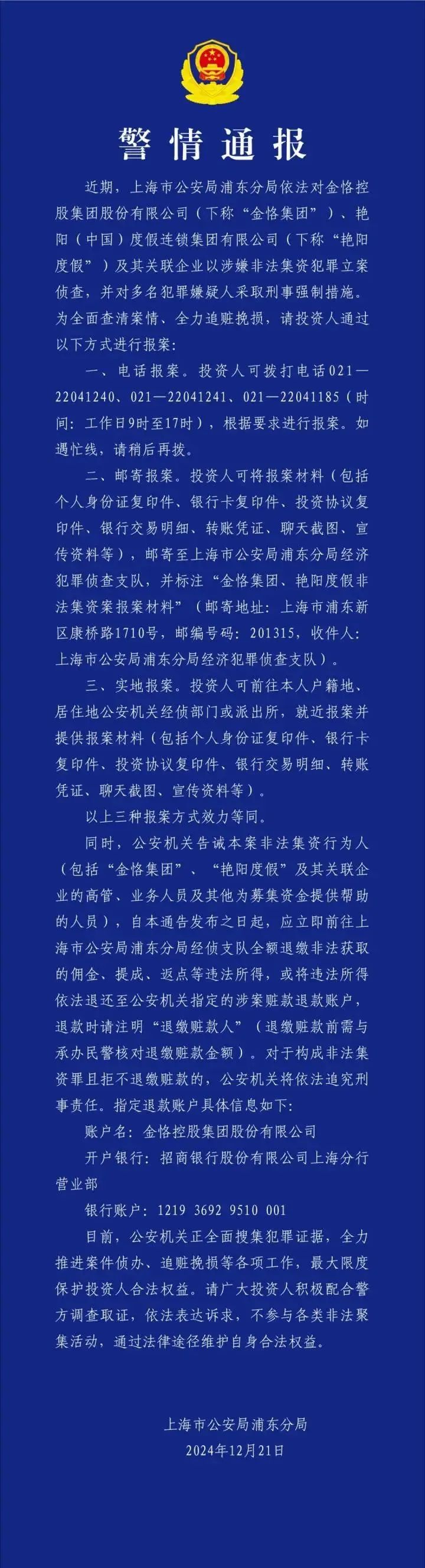 12月21日,上海浦东警方发布警情通报:金恪集团、艳阳度假等涉嫌非法集资犯罪已被立案侦查。