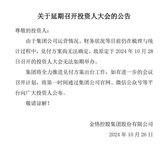 10月26日,金恪集团曾发布关于延期召开投资人大会的公告,称“由于集团公司运营情况、财务状况等目前仍在梳理与统计过程中,兑付方案尚无法确定,故原定于2024年10月28日召开的投资人大会无法如期举办”。