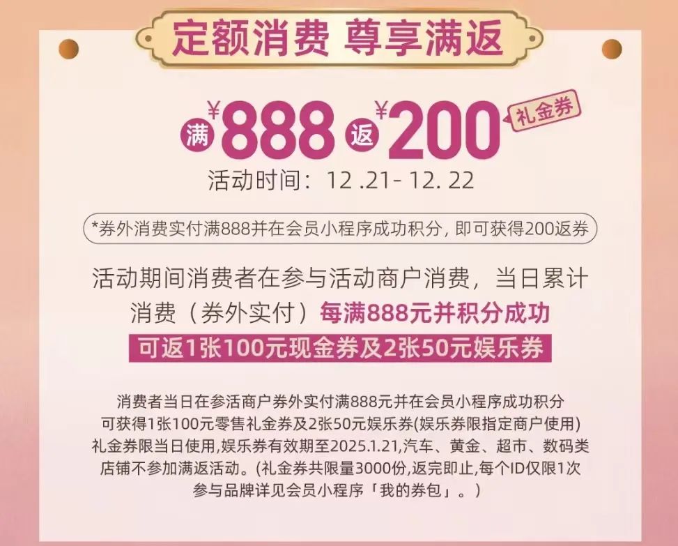 12.21-12.22两天还可享受满888返200礼金劵的活动