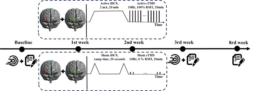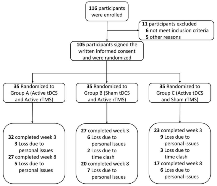 该研究采取双盲随机对照试验,将符合入排标准的105位患者随机分配至三组:A组为真tDCS+真rTMS,B组为伪tDCS+真rTMS,C组为真tDCS+假rTMS,所有患者在试验期间均保持原有药物治疗方案。