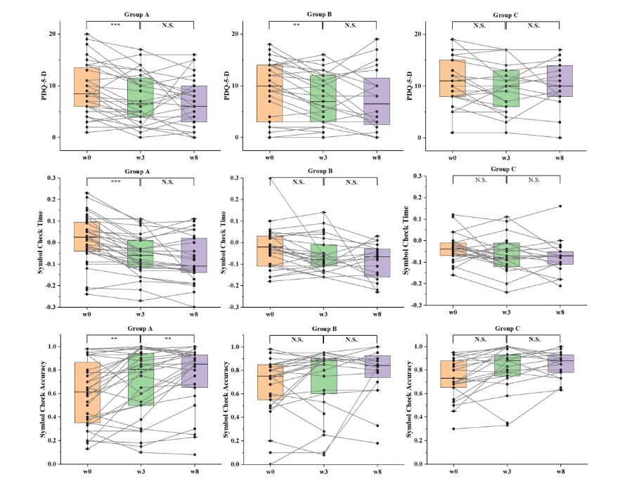真rTMS与真tDCS联合治疗(A组)显著提升了认知功能,与其他治疗组合相比效果更优。统计分析表明,在第3周,A组在Symbol Check时间和准确性上显著优于B组和C组,且在第8周,A组在Symbol Check准确性上仍表现出显著改善(P<0.01)。此外,A组和B组在第0周至第3周期间,基于PDQ-5-D的认知障碍评分均显著改善。这些结果表明,rTMS与tDCS的联合应用对双相情感障碍患者的认知提升具有协同作用。