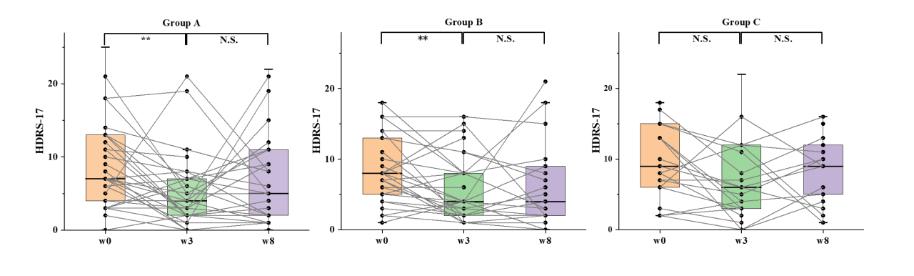 A组和B组的抑郁症状严重程度从基线到第3周均显著改善(P<0.01)。这些结果表明,真的tDCS和rTMS对缓解残余抑郁症状具有重要作用。