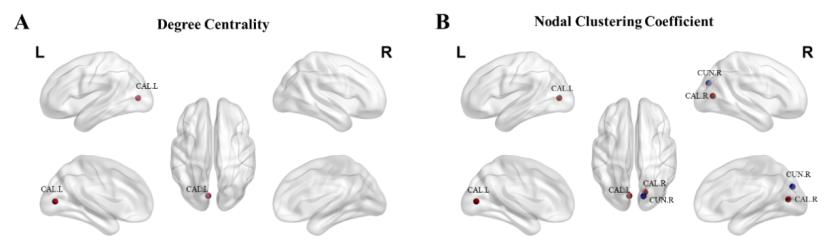 在默认模式网络(DMN)、背侧注意网络(DAN)和其他6个功能网络的全局指标中,各组之间未观察到显著变化。然而,A组视觉网络(VIS)的节点指标在干预前后表现出显著差异(P<0.05)。联合电磁刺激后,左侧距状沟周围皮层的节点度中心性(DC)和节点聚类系数(NC)显著增加,而右侧楔前叶的NC则呈下降趋势,提示视觉皮层可能发生神经可塑性变化。