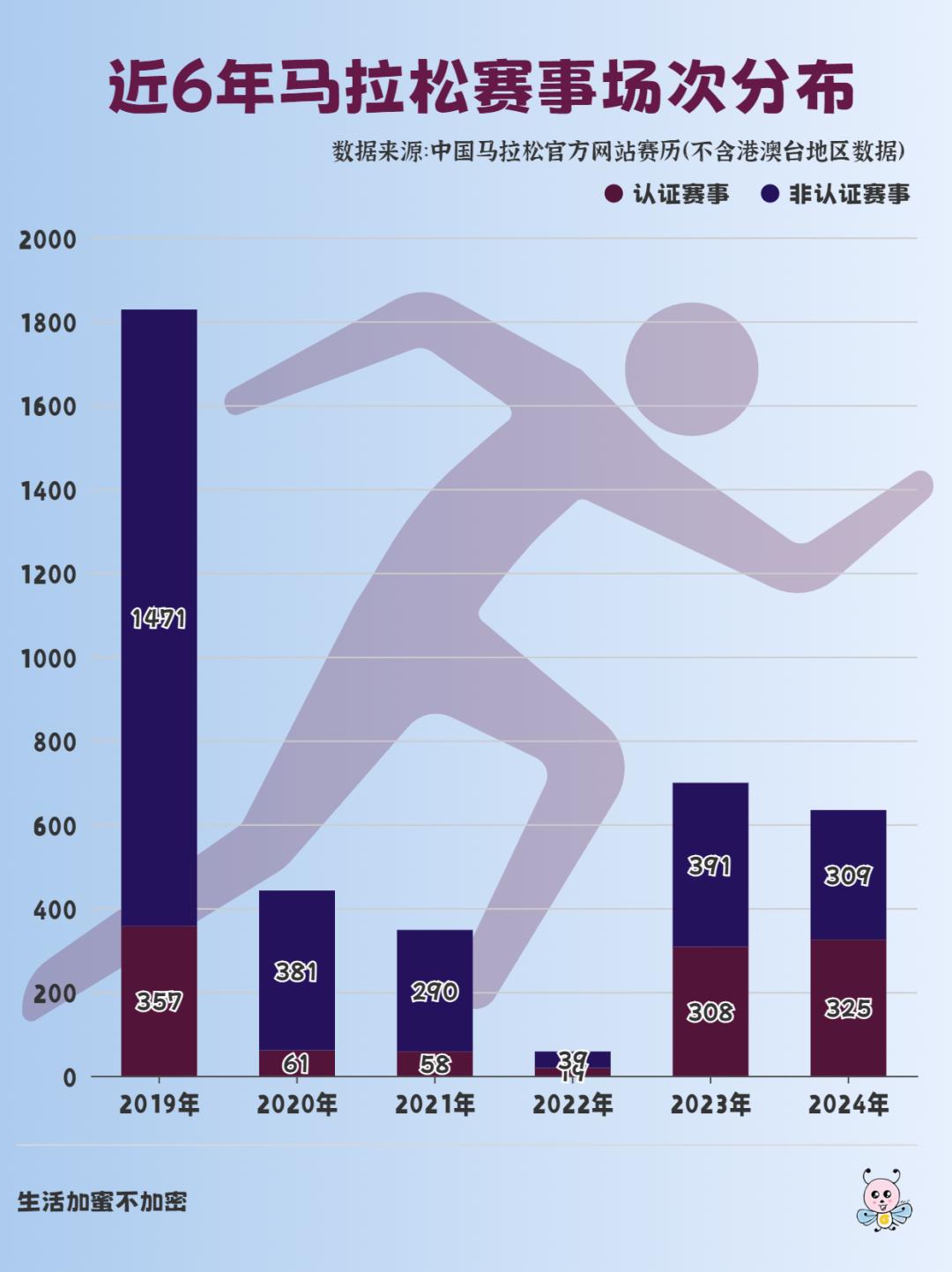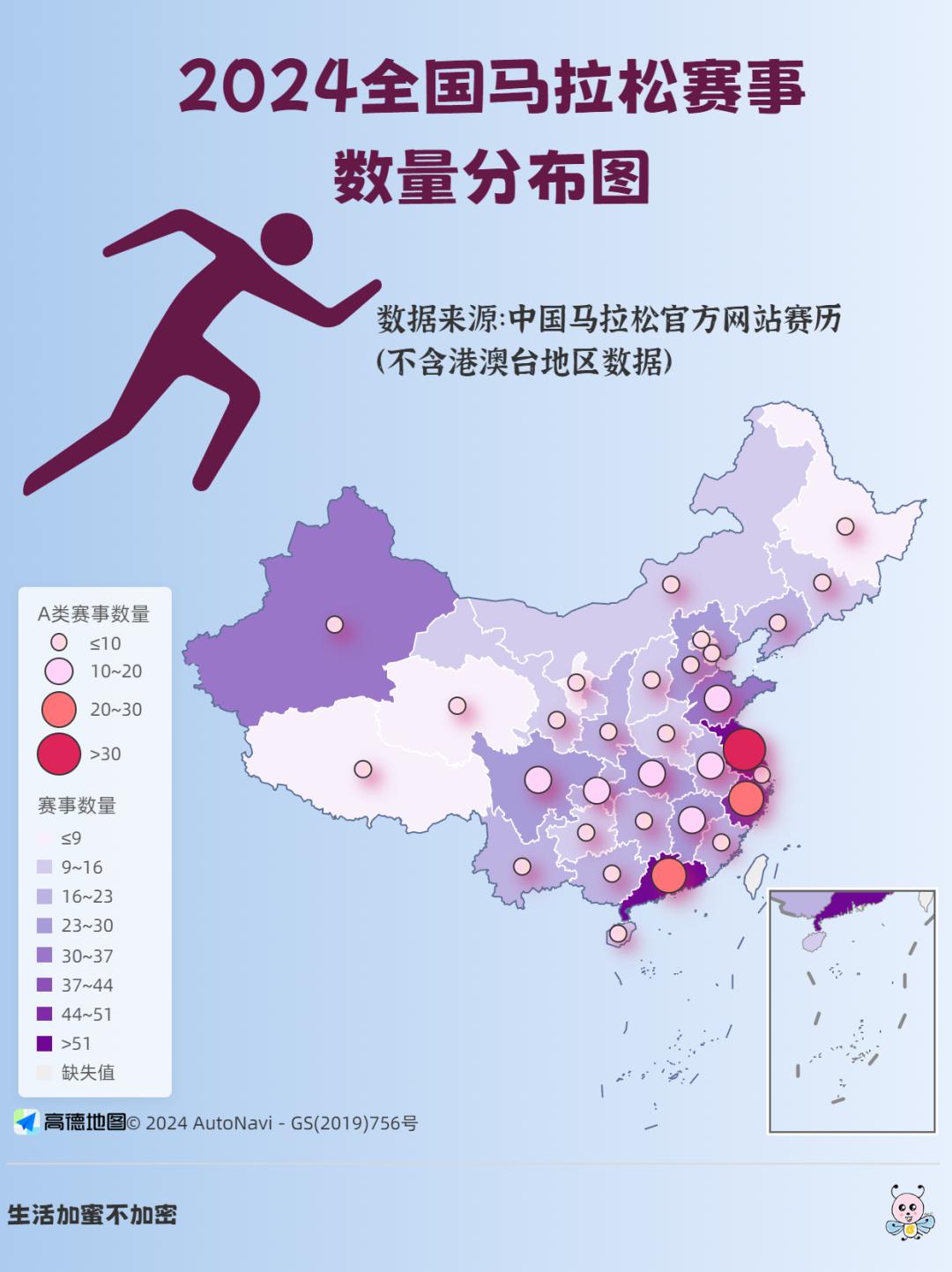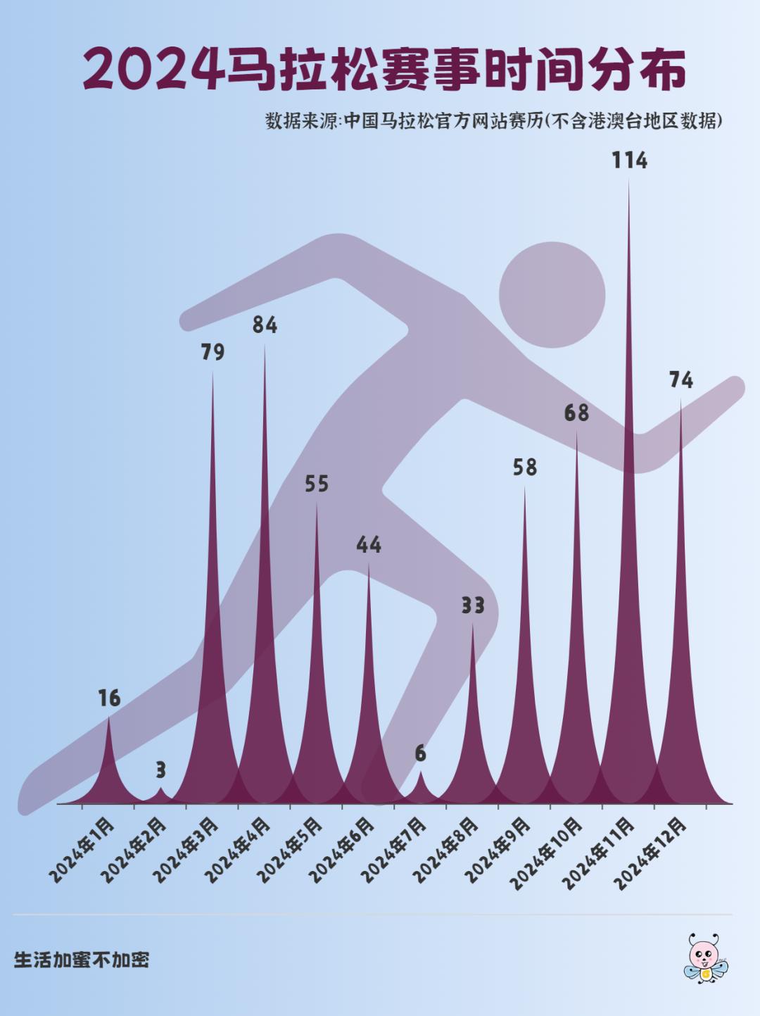 由于中国马拉松官网上更新了下半年的马拉松赛事数据,本期内容我们再次依据中国马拉松官网上的赛事数据,对2024年度全年马拉松赛事进行盘点,对9月发布的可视化分析内容进行补充。后面如果官网上的数据有更新,我们再随时补充。