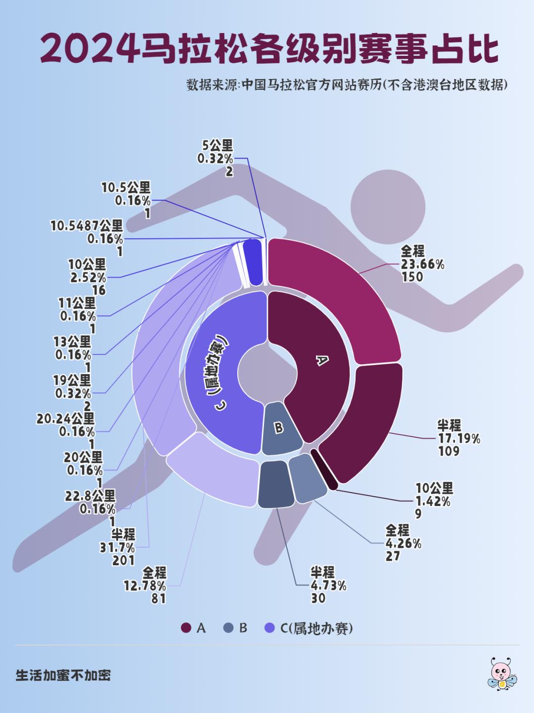 其中,A类赛事和B类赛事均以全马和半马为主,C类赛事(属地办赛)的项目比较多,除了全马和半马,还有四分之一马、10公里、5公里等项目,向更多的跑步爱好者提供更加多样化的选项。