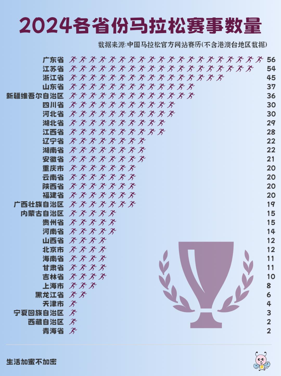 对赛事数据按省份进行统计,2024年全年,广东省举办的马拉松赛事最多,多达56场,其次是江苏省和浙江省。
