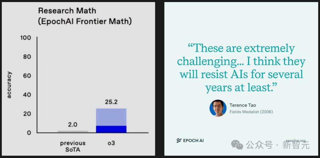 与此同时,o3在数学基准FrontierMath惊艳表现令人生畏,甚至击穿了陶哲轩的预言。
