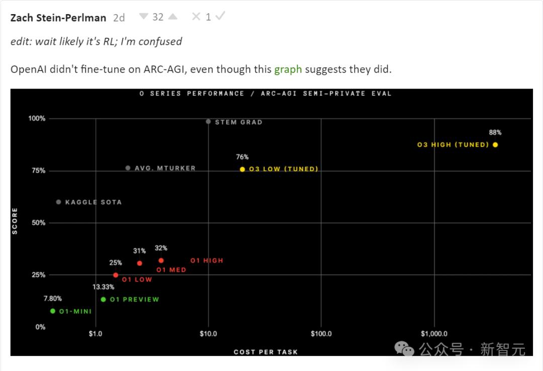 这个这个说法为真,那o3所取得的分数,显然占了很大便宜。OpenAI研究员Zach Stein-Perlman反驳说,他们没有针对ARC对o3做过微调。