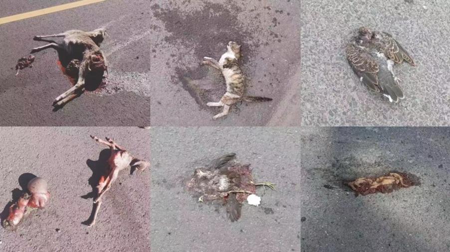 因路杀而死的动物,点击图片了解路杀|南京大学动物行为与保护实验室习惯了过路车辆投喂的动物,会为了得到食物而长时间停留聚集在道路旁,降低对车辆的警惕性,这让它们更容易遭遇路杀——而这很可能也是可可西里狼被大货车撞死的原因。