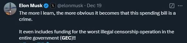 当地时间12月19日,马斯克发文抨击众议院议长约翰逊的预算案,称它甚至包含了向“最糟糕的非法审查机构(GEC)”提供资金。 社交媒体平台X