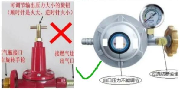 使用不可调节减压阀。使用不可调节减压阀可以确保液化气体的压力不会超过安全范围,从而保证使用安全。不能使用手柄或旋钮式的减压阀,以防调压器调节的燃气压力被故意或者无意调高,导致燃烧异常。