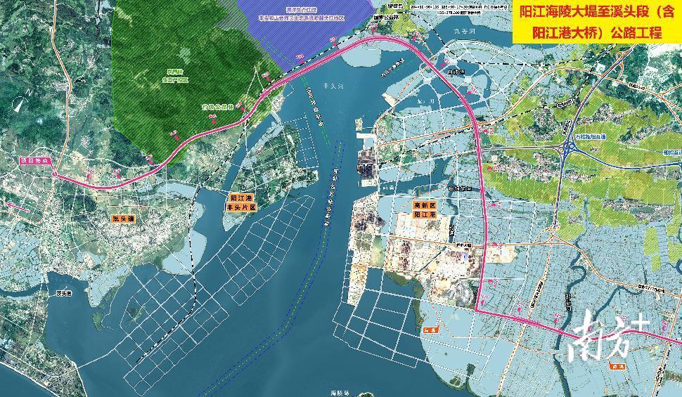 作为阳江交通领域“新地标”,阳江海陵大堤至溪头段(含阳江港特大桥)公路工程总投资超36亿元,全长23.928公里(阳江港大桥长4.77公里),起于阳江滨海新区(阳江高新区)平冈镇,经临港工业园、跨阳阳铁路、省道540线后设阳江港大桥跨越九姜河、丰头河,至阳西县凤凰山边缘展线,终于溪头镇与省道278线平交。
