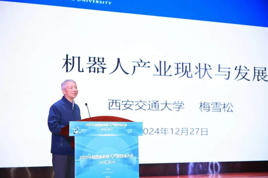 中国工程院院士、西安交通大学校长张立群视频致辞西安交通大学教授、博士生导师,陕西省智能机器人重点实验室主任、西安交通大学智能机器人创新研究院院长梅雪松以《机器人产业现状与发展》为主题作了主旨报告。“未来的世界就是人类和机器人共存的世界,机器人的占比会逐渐增加,会在更广泛的场景下执行复杂任务,应对多变环境。”梅雪松认为,未来机器人的发展与人工智能将结合得更加紧密,这对机器人决策和大脑起了决定性作用。陕西省机器人产业发展可以在医疗康复应用场景和人形机器人方面有所作为,但仍需加大基础科研投入、优化科研生态、撬动政策资金支持,推动更多创新成果落地,助力陕西省机器人产业加速发展。