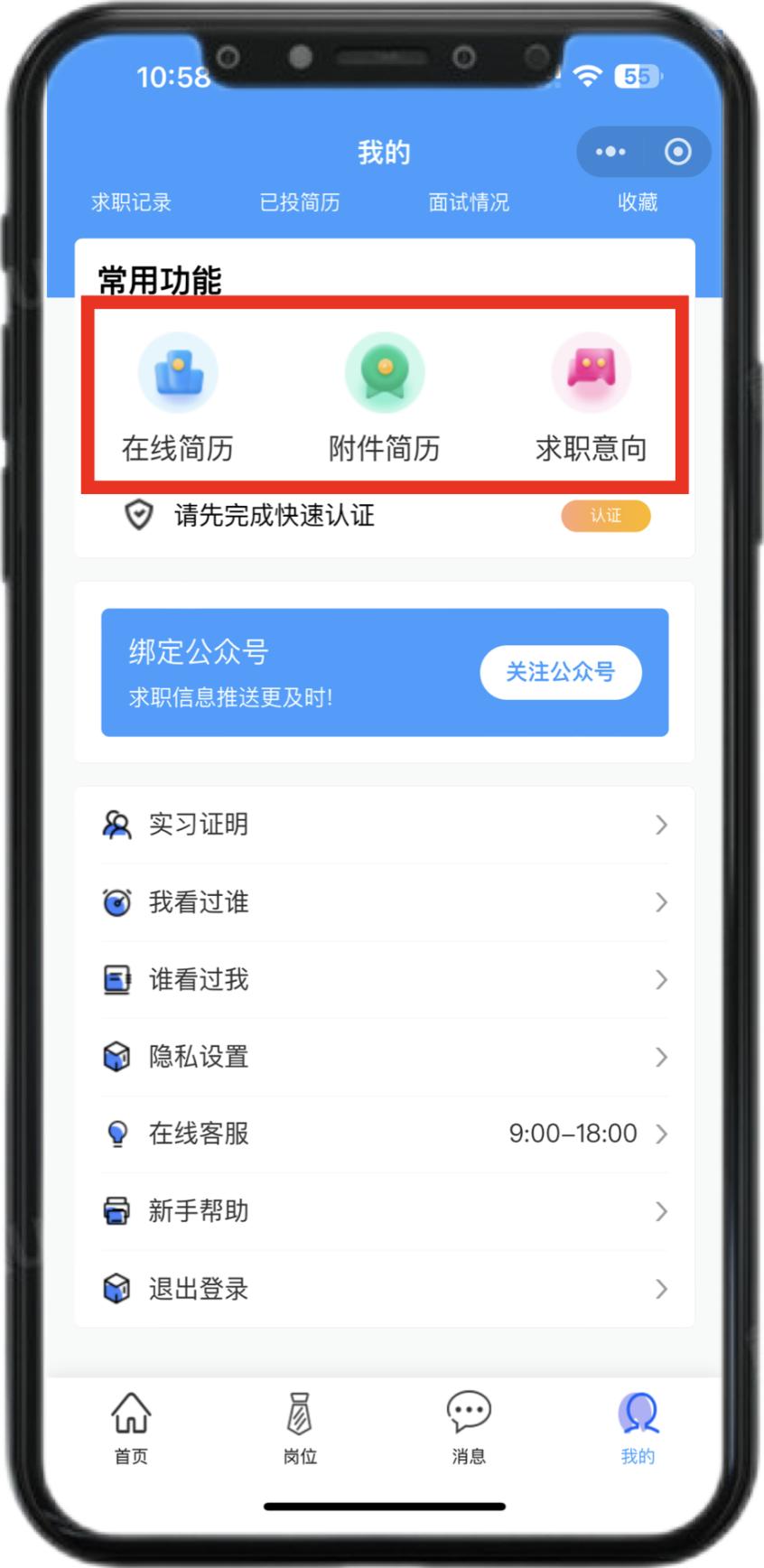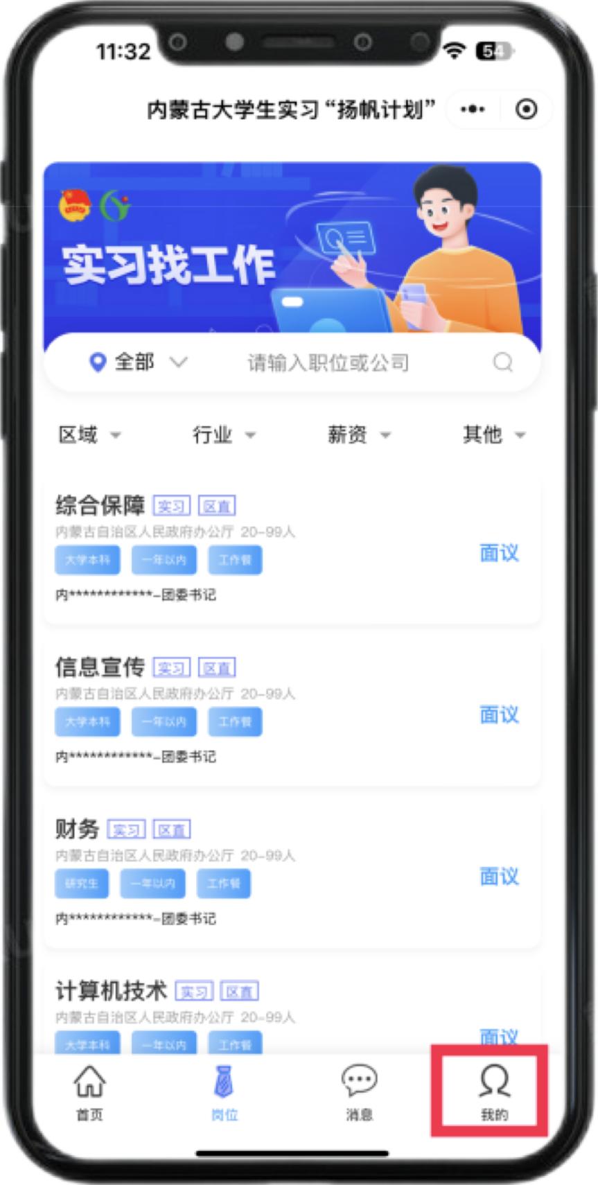 2.选择【我要应聘】,进入主页后找到【我的】,根据提示授权手机号。