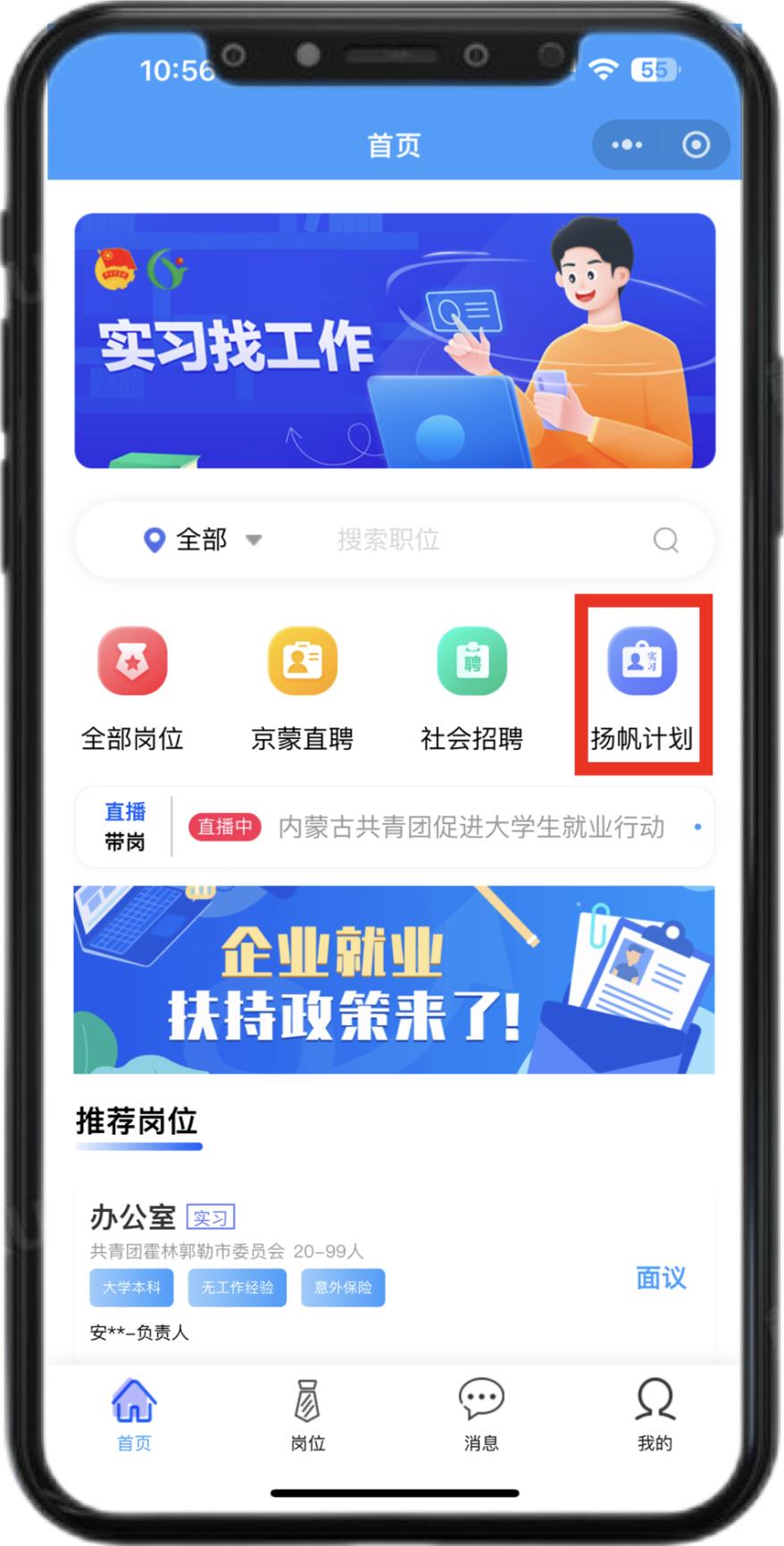 3.手机号授权成功后,返回【我的】完善在线简历并提交审核,审核通过后通过点击【主页】-【扬帆计划】即可选择心仪的实习岗位投递简历啦!