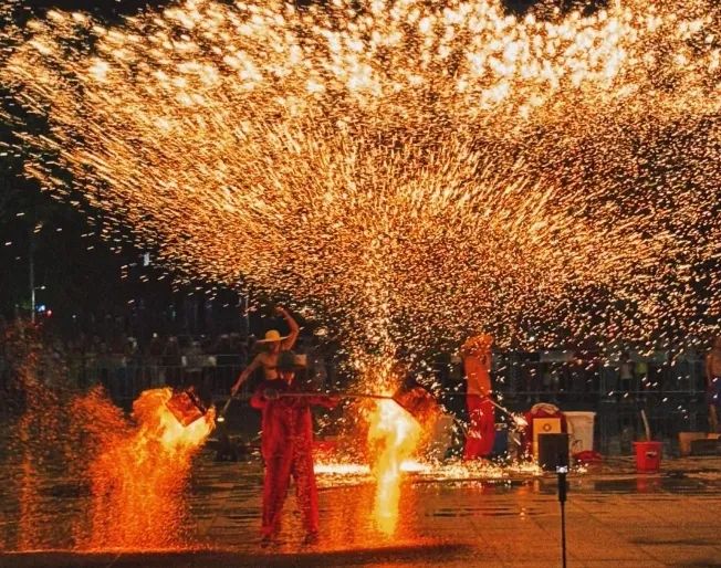 上演火壶、打铁花、川剧变脸传统非遗表演,展现传统技艺与现代艺术相融合独特魅力,形成绚丽多彩的火舞表演。14千人骑游