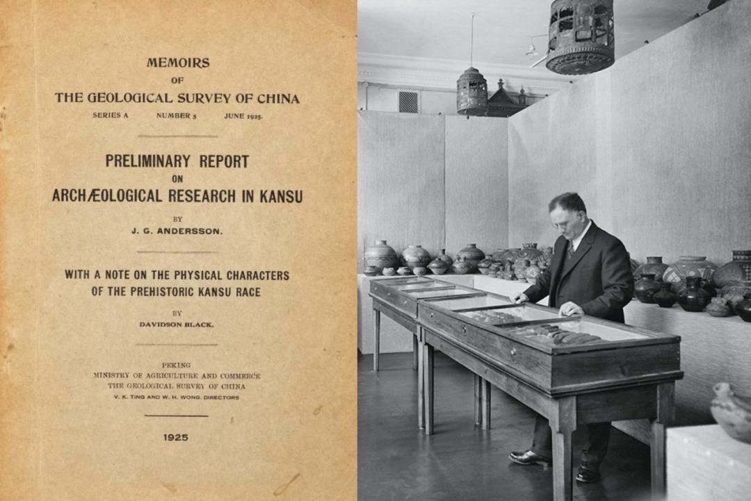 左:安特生发表在《中国古生物志》的《甘肃考古记》;右:安特生在为初建的东方博物馆布展在西北科考团启程的同一天,安特生也在哈尔滨登上泛西伯利亚列车,告别了自己先后生活了12年之久的第二故乡。最后两年的繁忙奔波,特别是关于赫定西北科考团的各种纷争起落,使得安特生身心疲惫。在斯德哥尔摩家中的海边别墅和意大利里维埃拉休养了三个月之后,他才逐渐恢复。在接下来的几年里,安特生开始分类整理从中国挖掘和收购的文物,与各国同行切磋交流,举办学术会议和展览,忙碌而富有成效。1929年安特生创办了《远东博物馆馆刊》,在创刊号上简短回顾了自己在中国的经历,他的两部著作《中国人和企鹅》与《黄土的儿女:中国史前史研究》相继问世。1931-1933年间,由于瑞典克朗升值及资金短缺,《中国古生物志》的出版遇到困难,乌普萨拉大学的中国考古藏品无法按期归还,安特生为最终解决这些问题做了很多努力。