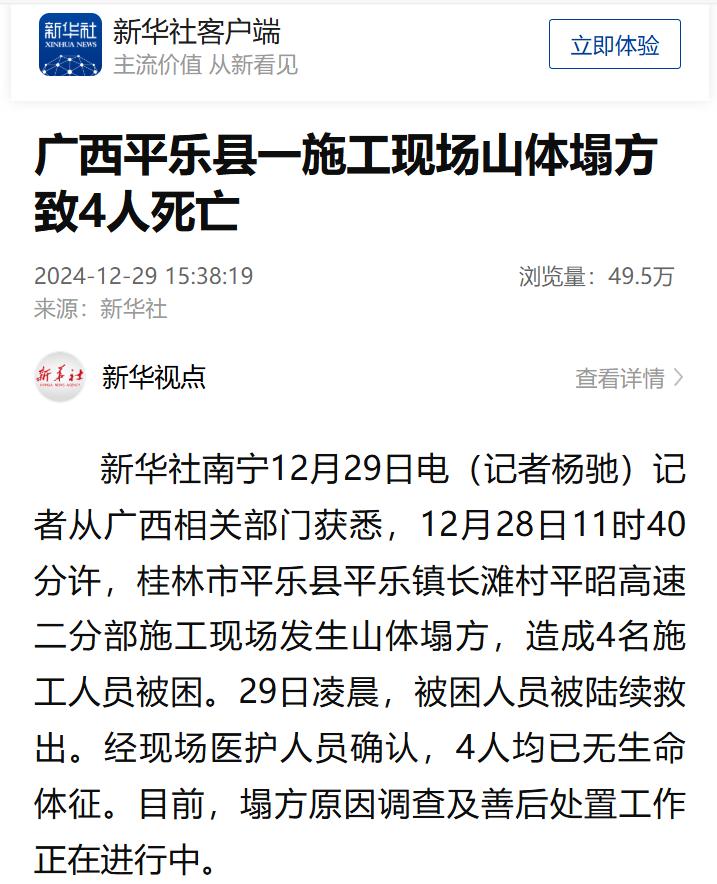 据新华社消息,12月28日11时40分许,广西桂林市平乐县平乐镇长滩村平昭高速二分部施工现场发生山体塌方,造成4名施工人员被困。29日凌晨,被困人员被陆续救出。经现场医护人员确认,4人均已无生命体征。目前,塌方原因调查及善后处置工作正在进行中。