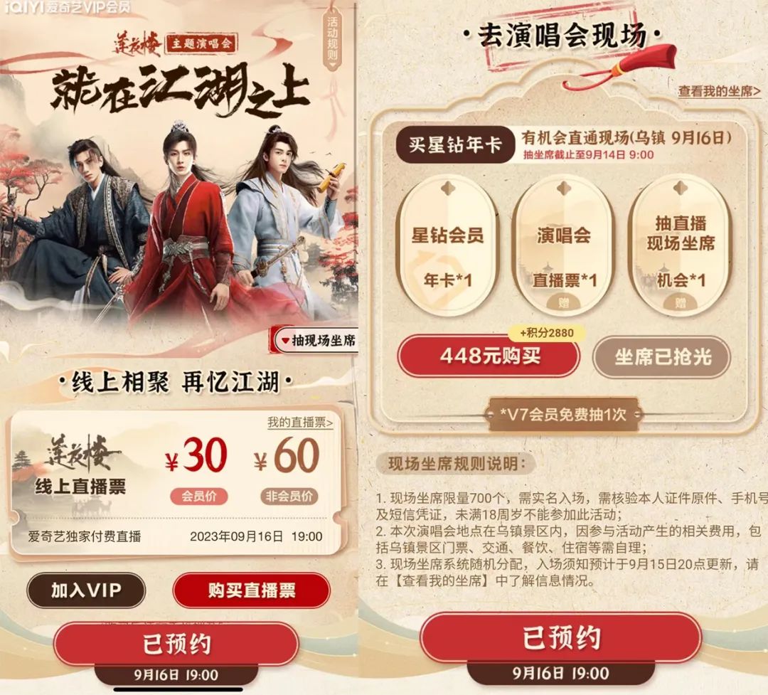 2023年,由成毅、曾舜曦、肖顺尧等演员出演的《莲花楼》爆火,主题演唱会随之而来,线上直播和线下演出“双管齐下”。 爱奇艺线上直播定价:会员30元,非会员60元,这价格“堪比去电影院看场电影”。而在线下观演的门槛更高——只有购买488元星钻VIP年卡,才有资格抽取现场座席的机会。