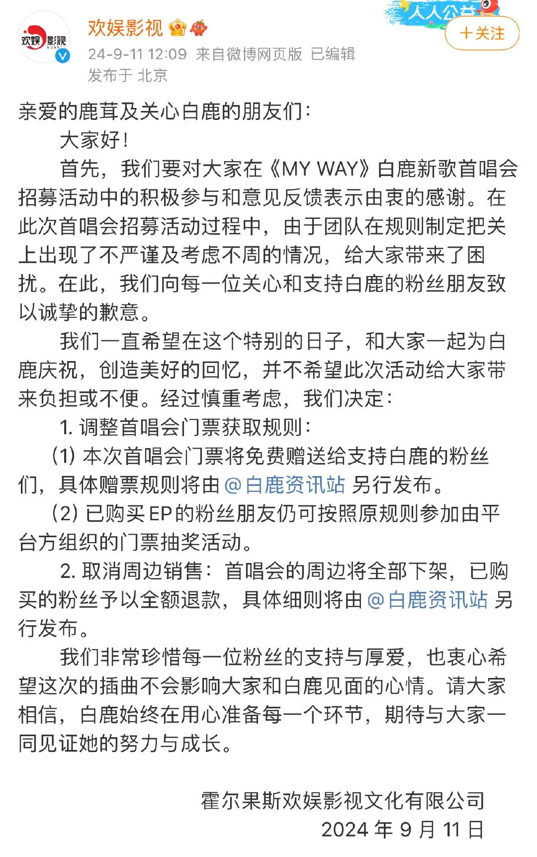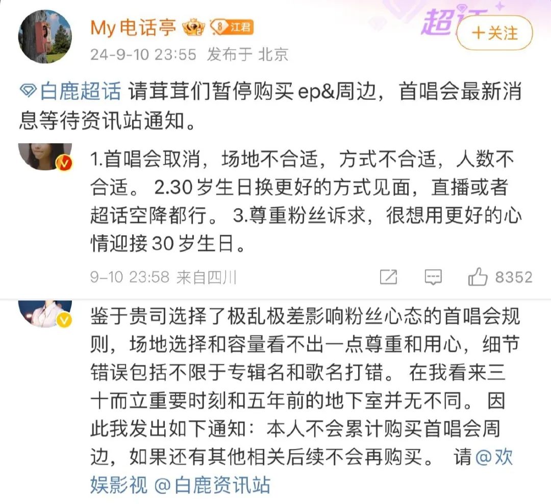早前,需要够买满35元周边,才有资格抽演唱会门票的规则,引发粉丝不满;随后,粉丝指出,场地选择和容量都并不合适做演唱会,在其他细节上,甚至专辑名和歌名都打错。“欢娱就是一个巨大的草台班子”此类评价在网络上层出不穷。欢娱立即对门票风波实行补救措施,宣布生日首唱会免费入场,购买的周边也全额退款,这才打动了粉丝。但在演唱会现场,白鹿的唱功和舞台表现,再次遭到质疑。对于演唱会而言,这种“去专业化”却又“商业化”的做法,是否会成为流量演员的常态,成为他们的困境?