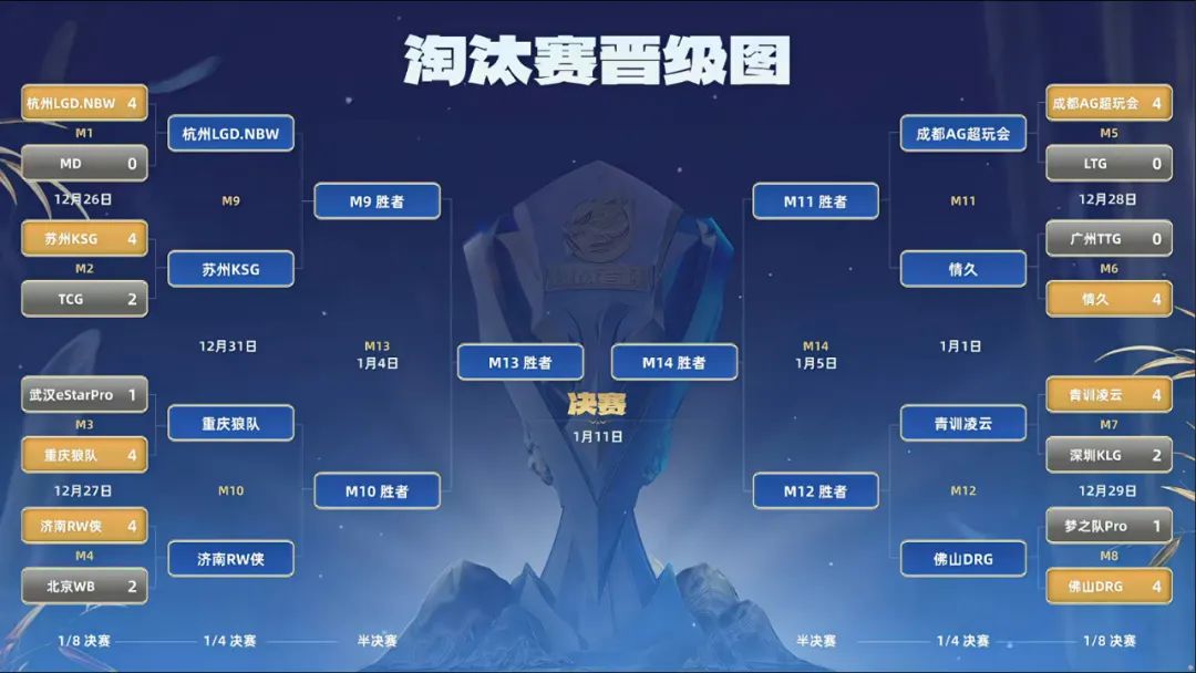 淘汰赛八进四的对阵也随之出炉:2024年12月31日14:00, 杭州LGD.NBW vs 苏州KSG