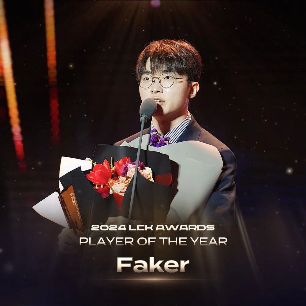 在2024 LCK颁奖典礼上,Faker获得年度最佳选手称号。此外,还颁发了年度最佳阵容等奖项,其中年度最佳上单由Zeus获得;年度最佳打野由Oner获得;年度最佳中单由Faker获得;年度最佳AD由Gumayusi获得;年度最佳辅助由Keria获得。EWC 2025剩6个项目未官宣