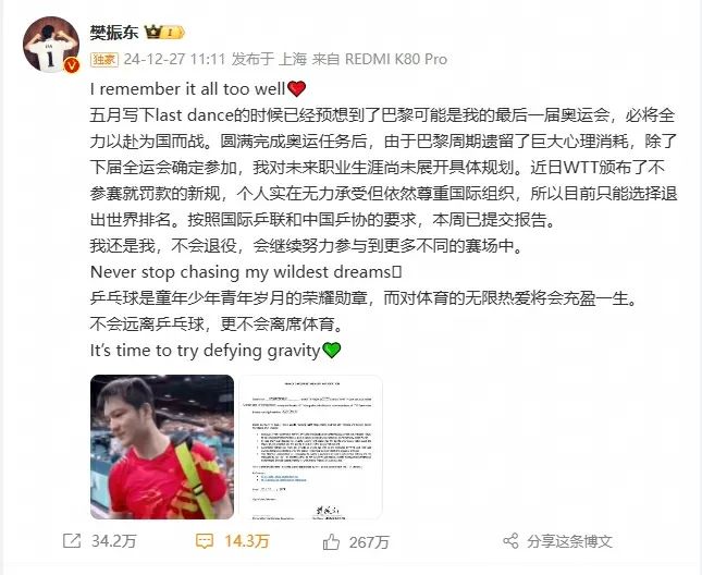 WTT的条文与赛程重复一下樊振东之前的声明:奥运会后需要更长时间恢复,但不参赛就会被WTT罚款,所以选择签署文件退出世界排名。