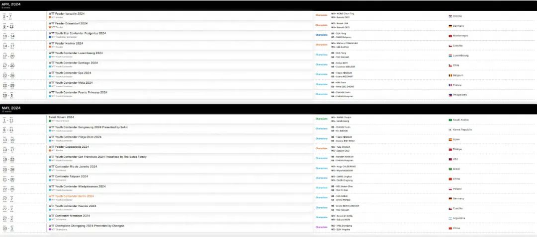 2024WTT1月-5月赛事如图所示这种独占性满足了WTT的商业化、票房需求,但对于绝大多数运动员来说,体力、精力都挑战颇大:数量繁多WTT比赛舟车劳顿,竞争激烈同时奖金不高,以生意来说很难回本,不参加还要承受积分和罚款的额外损失。
