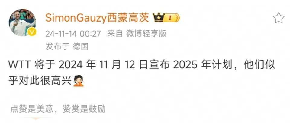 樊振东的说法也不是孤证:除了之前的阿鲁纳纠纷提及的各种WTT执行上的模糊不清,法国的西蒙-高茨等选手也不止一次在社交媒体上吐槽过WTT组织协调和执行上的不专业,高茨公开发问赛历何时确定?自己根本不知道明年要去哪儿、做什么。