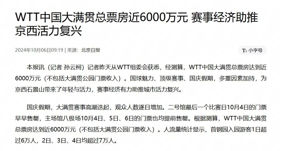 从WTT在社媒贯穿全年的热度,以及公布的票房数据来看,WTT显然是成功的,以黄金周期间举办的WTT中国大满贯为例,单站赛事总票房达到近6000万元,这其中还不包括大满贯公园门票收入。