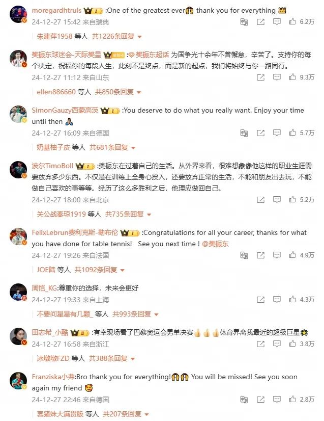 来自法国、瑞典、德国、韩国等外协会知名运动员也公开力挺樊振东。