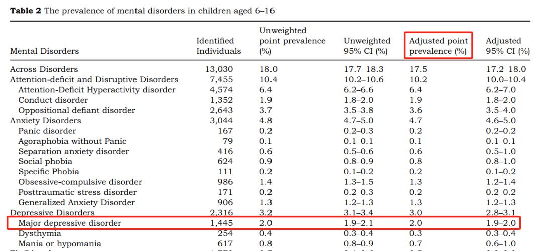 怀疑是否成立,还得从原始文献那里找到答案。虽然发言人没有提到引用数据的来源,但确实有文献提到我国6岁~16岁人群的重度抑郁障碍患病率为2.0%,并且这篇文章的工作做得很扎实。