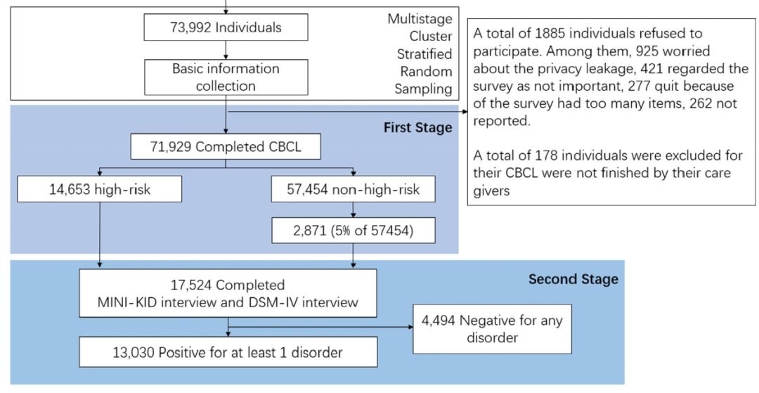研究分为两个阶段,阶段一使用CBCL(儿童行为量表)对参与者进行筛查,阶段二由50名精神科医生对筛查后的参与者做访谈面诊,对数据作加权匹配后,最终得出了包括重度抑郁障碍在内的我国儿童青少年心理障碍的整体患病率。