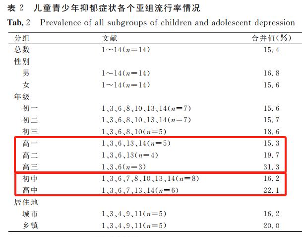 根据相关元分析研究,高中生的抑郁症状流行率显著高于初中生,高三学生显著高于高一、高二学生[11]所以发言人可以说“我国的儿童抑郁症患病率只有大概2%左右”,但对于中学青少年,即使按最严格的标准,其抑郁症患病率也一定大于2%。