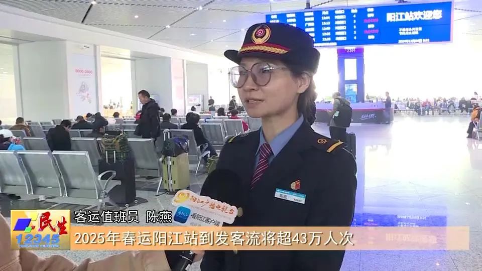 客运值班员 陈燕:根据往年数据预测,2025年春运阳江站到发客流将超43万人次。节前客流以到达流为主,最高峰预计将出现在1月24日左右,节后客流以出发流为主,最高峰预计将出现在2月5日左右。