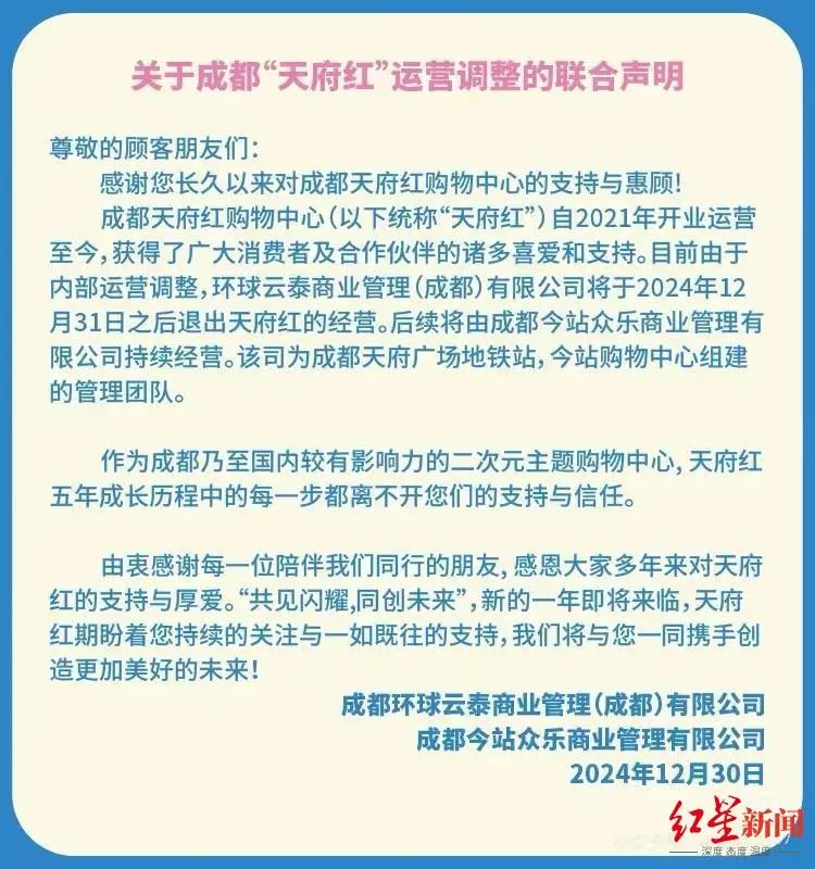 云泰商管和今站商管联合发布声明称,成都天府红购物中心(以下简称“天府红”)自2021年开业运营至今,由于内部运营调整,更换运营商。