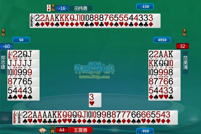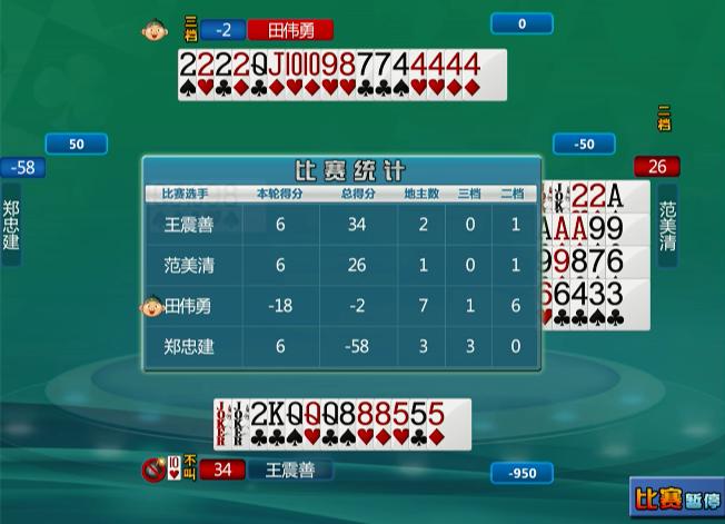 随着位列积分榜第二的范美清在第8盘再下一城,身处负分区的三四号位选手处境更为凶险。第9盘,三号位田伟勇叫二档做地主。在自己和中路都只剩下一手单牌的情况下,Q意外做大,让自己手上略显散乱的牌涉险过关,田伟勇积分回正。但好景不长,第13盘的荒番局,田伟勇三档做地主,但没能拿下,又回到了负分区。
