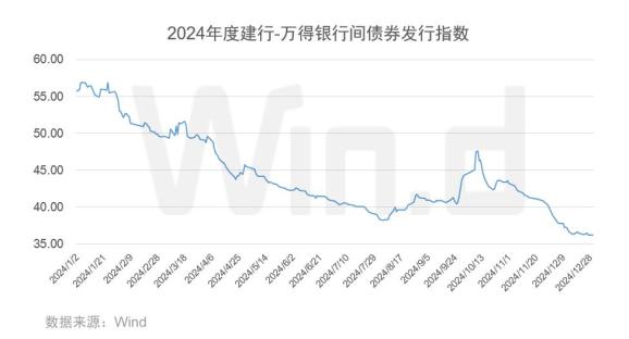 根据反映债券市场融资成本水平的“建行-万得银行间债券发行指数”显示, 2024年总体发行成本呈下降趋势。该指数新年伊始短暂震荡后即一路走低,从8月份开始经历了一次为期2个月的反弹之后再次下探,当前已至36-38的低位区间。