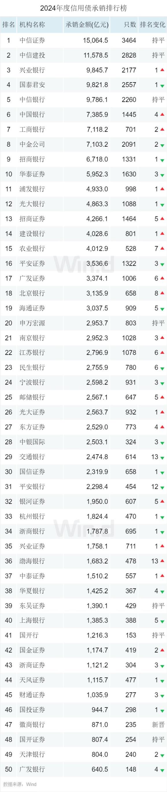 在债券承销方面2024年各家机构表现如何,Wind第一时间为您隆重揭幕2024年度中国内地市场债券承销排行榜。2024年度债券承销排行榜