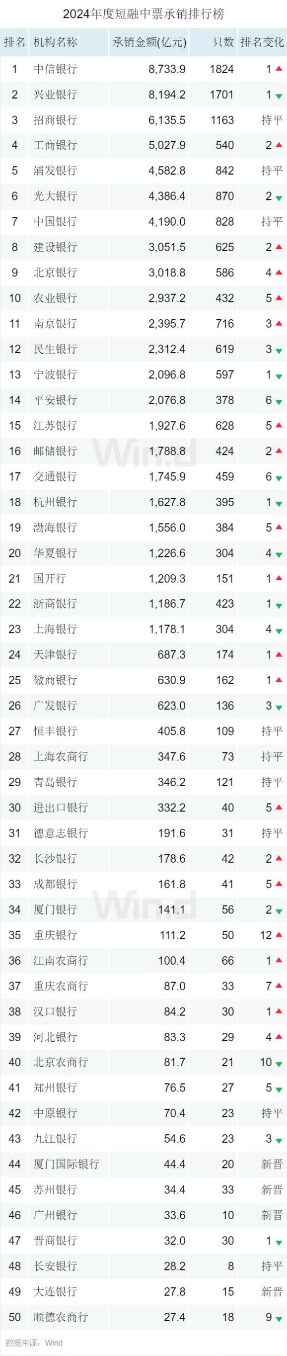 按Wind对银行间债务融资工具的统计口径,中信银行以9,600.1亿元位居第一,兴业银行承销金额8,883.0亿元位列第二,招商银行排名第三。