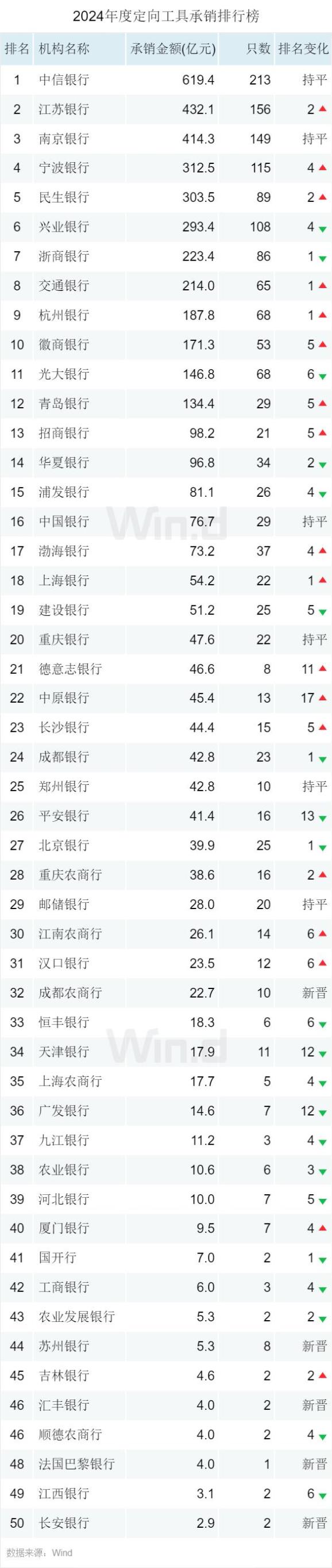 定向工具承销排行榜中信银行以承销金额619.4亿元登顶,江苏银行、南京银行紧随其后,承销金额分别为432.1亿元、414.3亿元。