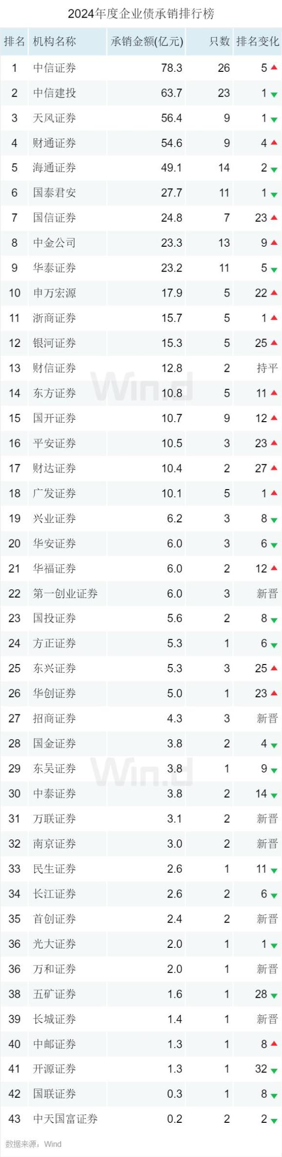 企业债方面,中信证券位列第一,2024年度承销78.3亿元,中信建投、天风证券位列二、三位,承销金额分别为63.7亿元和56.4亿元。