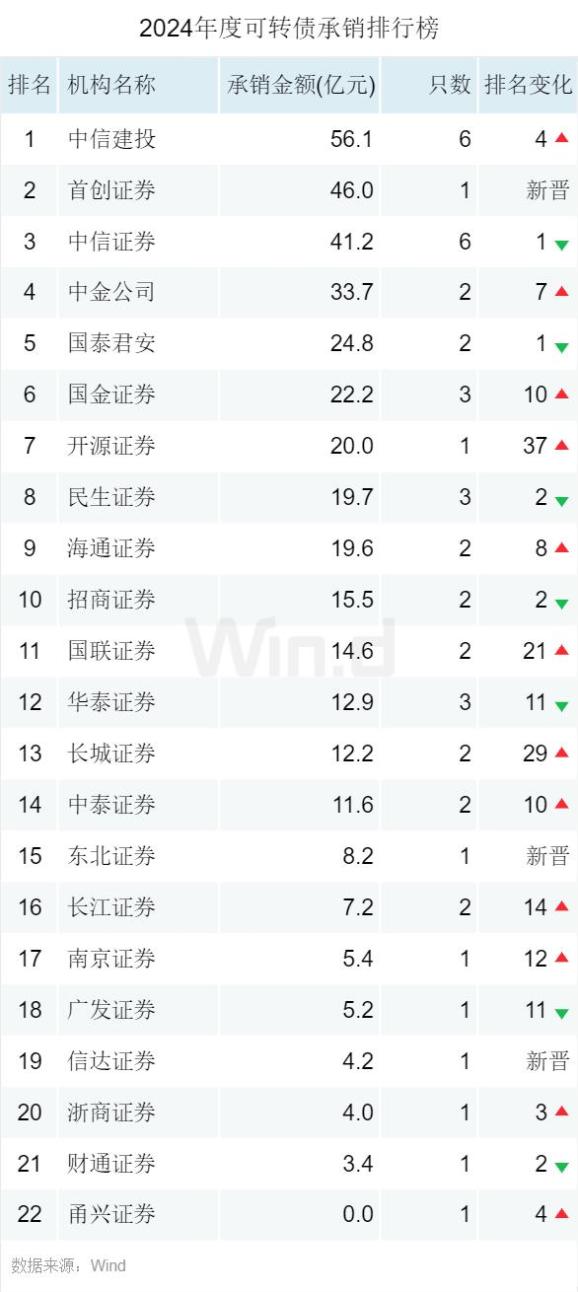 可转债承销排行榜中信建投以56.1亿元的承销金额摘得桂冠,首创证券承销金额为46.0亿元排名第二, 中信证券承销金额为41.2亿元排名第三。
