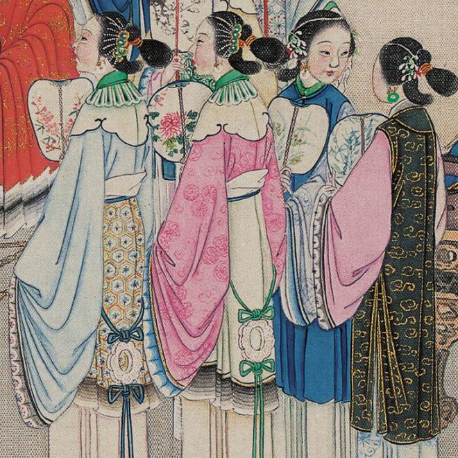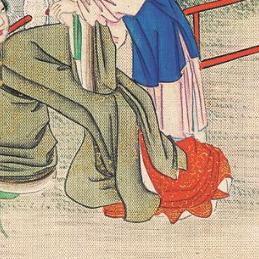 观察画作中十二钗一类的年轻女子,会发现她们的长裙外还有一层类似于围裙的短裙,这类裙子称为“腰裙”是画面描绘里人物服装中装饰性较强的部分,大多有锦纹纹饰,色彩绚丽,腰裙裙底以暗色收边。此外,裙子上的配饰也比较讲究,腰带正中挂上一根以丝带编成的“宫绦”,在中间打几个环结,然后下垂至地,一般不系环佩,作者在刻画人物背面时,往往会加上环佩以压住裙摆。