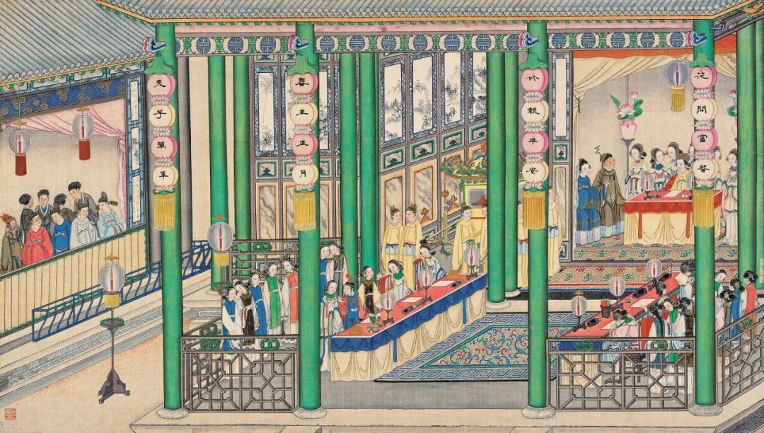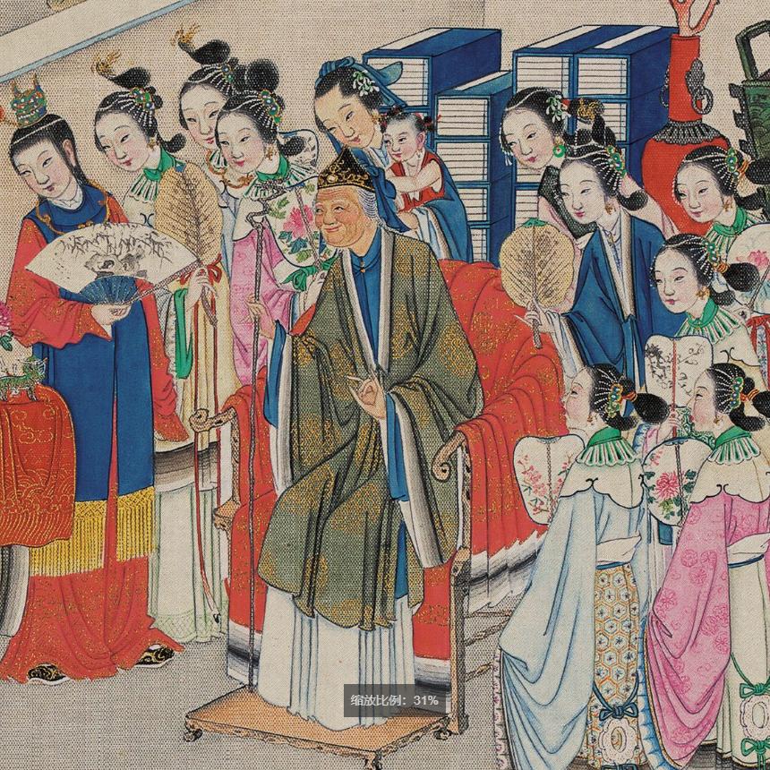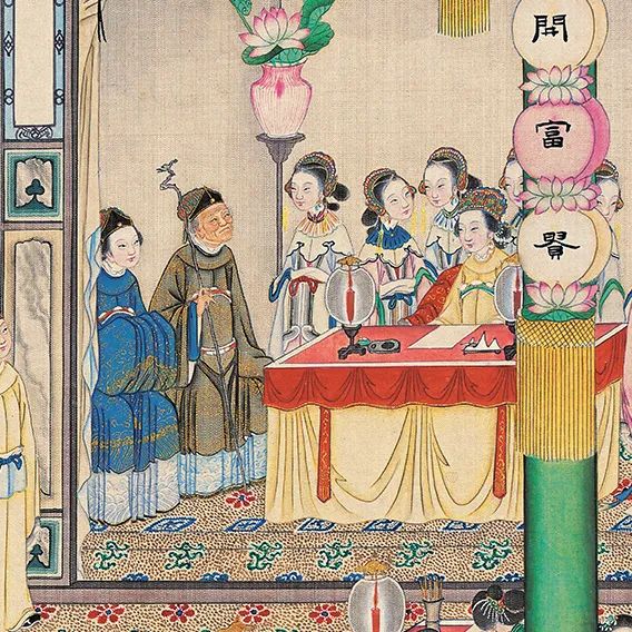 仔细观察貴妃筵宴題大观园一图,图中贾母、元妃等人的命服服饰都有金线织就的纹饰,孙温用金线勾勒,时至今日服装上的金线仍光彩夺目。